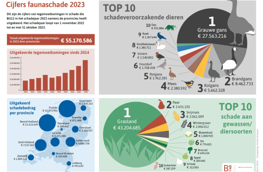 rovincies keerden in 2023 voor ruim € 55 miljoen uit aan tegemoetkomingen in faunaschade. Dat is 23% meer dan in 2022, toen bijna € 45 miljoen aan tegemoetkomingen werd uitbetaald. Het aantal aanvragen voor tegemoetkomingen steeg van bijna 7700 naar circa 8500. Download hier alle infographics over faunaschade over 2023.…