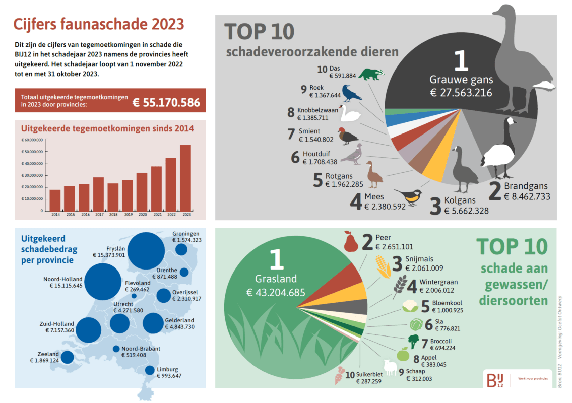 rovincies keerden in 2023 voor ruim € 55 miljoen uit aan tegemoetkomingen in faunaschade. Dat is 23% meer dan in 2022, toen bijna € 45 miljoen aan tegemoetkomingen werd uitbetaald. Het aantal aanvragen voor tegemoetkomingen steeg van bijna 7700 naar circa 8500.